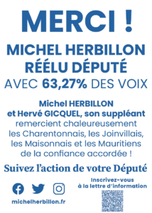 Michel HERBILLON continuera à défendre, comme il l’a toujours fait, avec ardeur et efficacité les dossiers concernant les habitants de notre circonscription et travaillera avec efficacité avec les Maires sur les projets des 4 villes.
